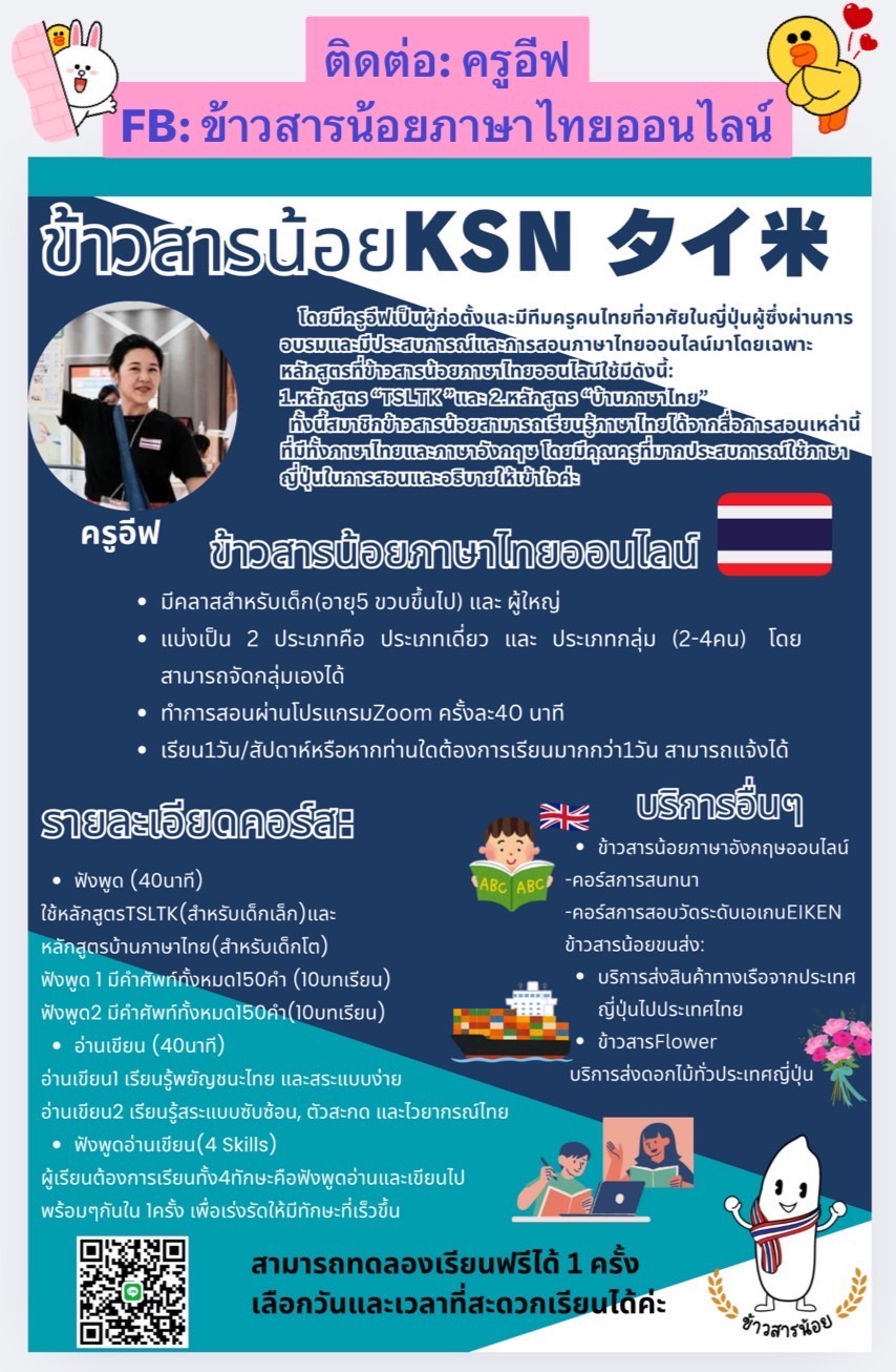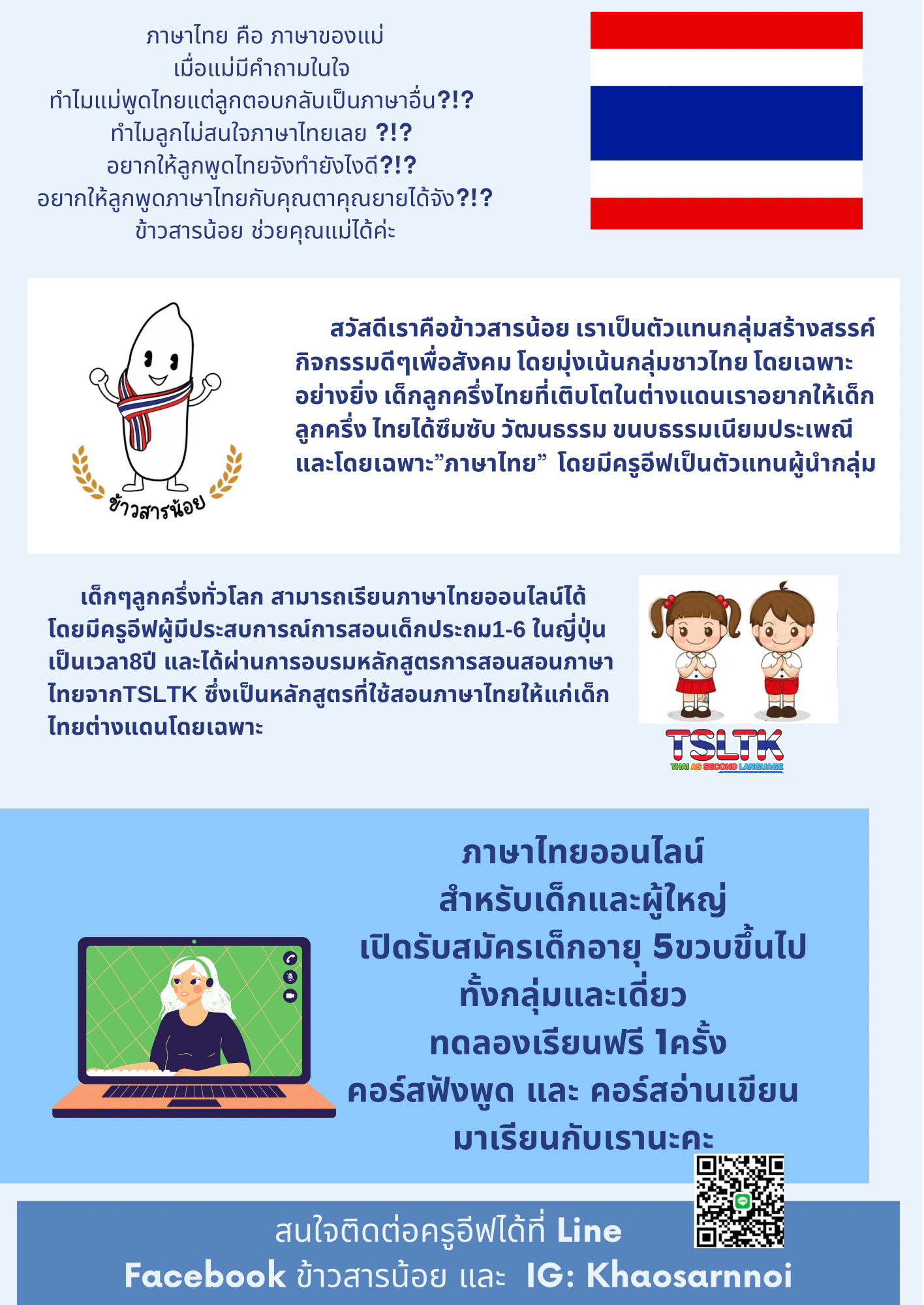 ดังนั้น “ข้าวสารน้อย” ขอเป็นตัวแทนคนไทยมุ่งสร้างกิจกรรมดีๆเพื่อสังคมโดยเฉพาะครอบครัวชาวไทยในประเทศญี่ปุ่น อยากให้เด็กไทยและลูกครึ่งไทยได้เรียนรู้ภาษาไทยและเข้าใจวัฒนธรรมและประเพณีไทย โดยได้จัดกลุ่มครูผู้มีประสบการณ์เปิดทำการสอนภาษาไทยออนไลน์เพื่อให้เด็กๆได้เรียนรู้และสนุกไปกับ ภาษาไทย, วัฒนธรรมไทย, มารยาทไทย, ขนบธรรมเนียมประเพณีของไทย และกิจกรรมต่างๆอีกมากมาย
